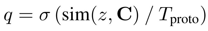 sematic pseudo label은 임베딩 된 featre z와 미리 정의된 prototype C와의 유사도 비교를 통해 가장 유사한 prototype을 pseudo label로 한다. 이에 관한 수식은 아래와 같으며 유사도는 cosine 유사도를 이용하나 방법론에 따라 상이할 수 있다.