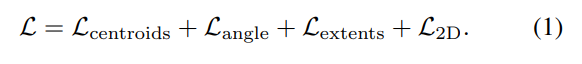 RGB-D YOLO의 loss함수는 심플합니다. 기존에 사용했던 거와 2D loss / centroid는 동일하며 w, h, d regression loss에 해당하는 extents의 경우 단순 l1 loss를 사용합니다. 이는 실험을 통해 얻어진 결과라고 합니다. yawing을 나타내는 angle에 대해서는 cos, sin으로 representation 하였으며, loss로 cosine similarity loss를 사용합니다.