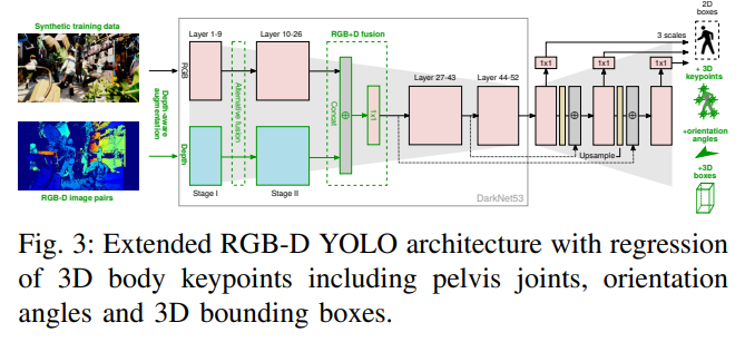 사용한 RGB-D YOLO detector의 파이프라인 입니다. 사실 특별할건 없고 욜로3의 기본적인 구조를 멀티모달 영상입력에 맞게 변형하여 설계하고, 아웃풋을 3D bbox에 맞게 바꾸어준 것 뿐입니다. 아키텍쳐에 대해서 더 궁금하신 분들은 제가 이전에 했던 리뷰 를 참고하시면 될듯합니다. 간단히만 말씀드리자면, 그냥 미들레벨에서 서로다른 모달리티를 concat하고 1×1 conv를 이용해 downscale하였습니다. depth-aware augmentation 등 추가적인 내용이 있긴한데 그러한 내용은 위에 링크걸어둔 리뷰를 참고해주세요.
