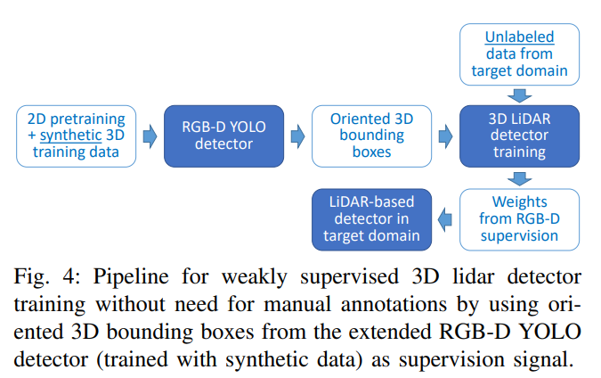위의 그림4 에서는 제가 설명했던 내용을 그림으로 잘 보여줍니다. 결국에 최종적인 목표인 LiDAR-based Detector를 학습시키기 위해 synthetic data로 학습한 RGB-D YOLO Detector를 사용하였습니다.