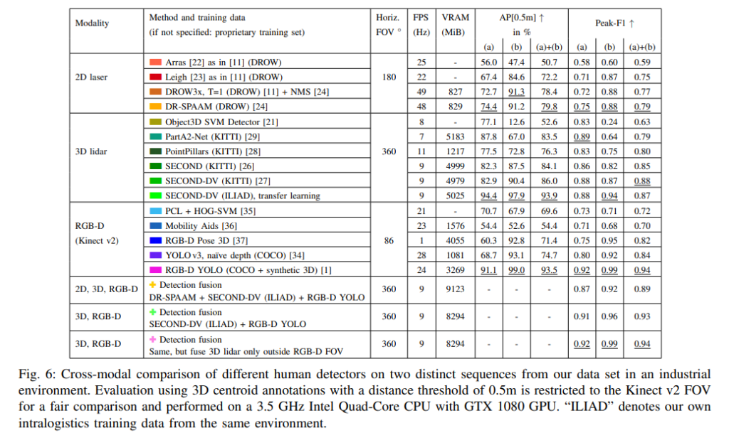 결국에 위의 테이블에서 정리한 것처럼 모달리티에 따라 SOTA 모델들을 사용하여 비교실험을 하였으며, 결과만 놓고 보자면 2D 라이다를 쓰는게 오히려 노이즈로 작용한다고 생각을 해야될거 같네요. 또한 실험결과만 놓고 보자면 굳이 3D 라이다를 사용하지 않고 RGB-D 센서만을 사용해도 intralogistics에서는 충분해 보이네요. 다만, 실험데이터셋이 공개되지 않았고 성능이 saturation된 점을 고려할 때 실험 결과를 신뢰할 수 있는지에 대한 아쉬움이 남네요. 좀 더 챌린징한 데이터셋에서는 경향성이 다를 수도 있으니까요.