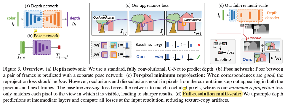 (c)는 pixel의 occlusion에서 비롯된 부정확한 depth 추정을 해결하는 방법에 대한 설명입니다. 기존 Baseline 방법론에서는 특정 pixel에서의 photometric error(pe) 를 계산할때 pe(t-1,t)와 pe(t,t+1) 의 평균치를 사용했다면, 본 논문에서는 최소값을 사용하겠다는 것입니다.