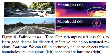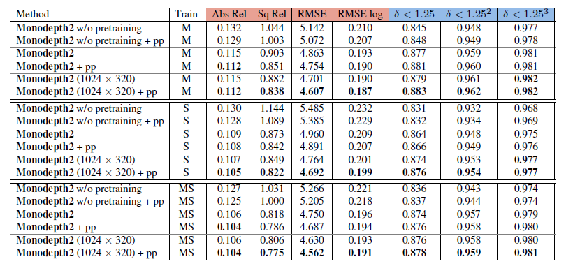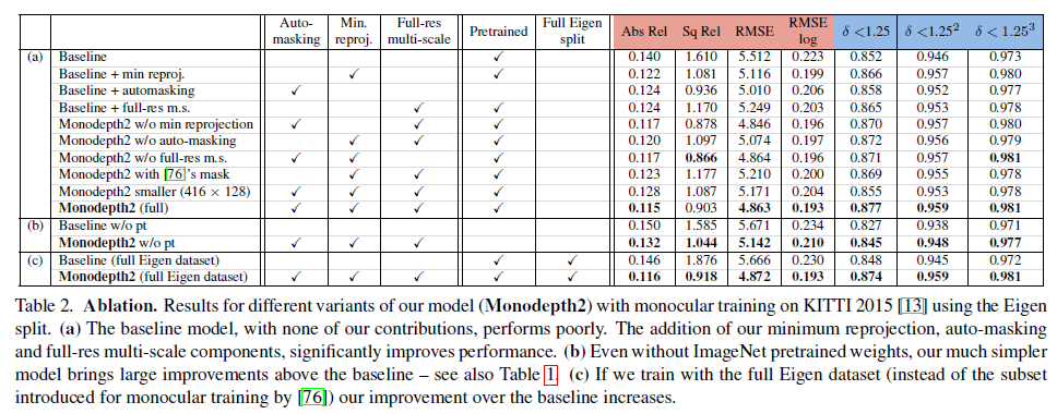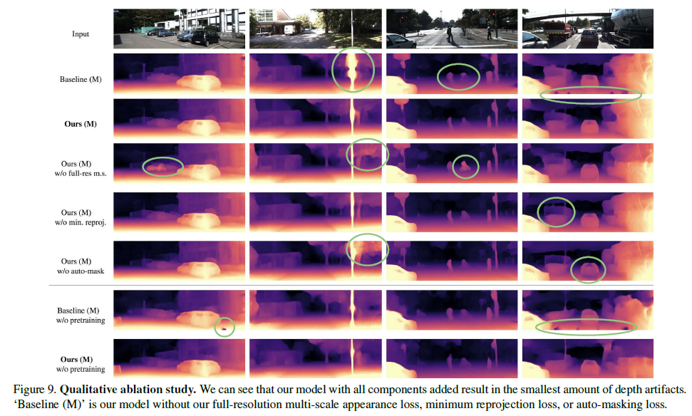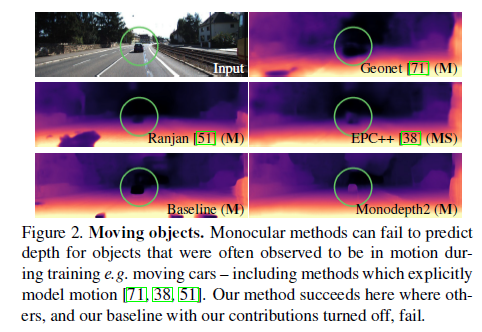 w/o auto-mask 의 결과가 흥미로운데, camera와 함께 움직이는 자동차에 대해 depth 예측이 정확하지 않은것을 볼 수 있습니다.
