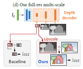 (d)는 depth decoder에서 나온 4가지 scale의 depth map을 활용해서 reprojection error를 구할 때, 서로 다른 scale의 depth map을 input image resolution에 맞게 upsampling 한 뒤에 reprojection error를 구하는 방식입니다.