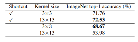 위의 표가 그 결과를 보여주고 있는데, 보시다시피 일단 shortcut은 일종의 서로 다른 receptive field를 가지는 여러 모델들 간에 앙상블 기법으로 볼 수도 있으며 이러한 관점에서 Large Kernel을 사용하게 될 경우 성능의 향상이 기존 small kernel보다 존재하지만, 만약 shortcut이 없다면 성능이 더 크게 감소하는 것을 확인할 수 있었습니다.