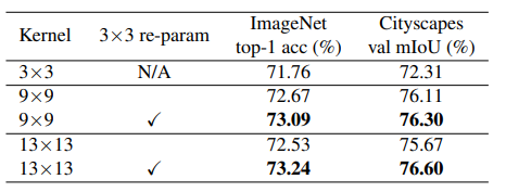 아무튼 저자는 이러한 re-parameterizing이 large kernel을 활용할 때 상당히 큰 이점이 있다고 주장합니다. 한 예시로 3×3 컨볼루션에서 9×9, 13×13으로 커널 사이즈를 키웠을 때 9×9 키운 것 대비 13×13의 성능이 조금 더 작은 것을 관측할 수 있습니다(72.67 vs 72.53, 76.11 vs 75.67) 하지만 Re-param 기법을 적용하였을 경우의 성능에서는 ImageNet과 Cityscape에서 모두 더 좋은 결과를 보여주고 있습니다.