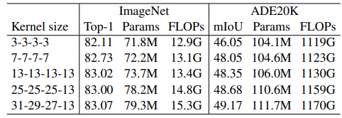 그리고 아시다시피 각 stage 별로 Kxk DW conv에서 K는 [31, 29, 27, 13]으로 구성이 되어있습니다.