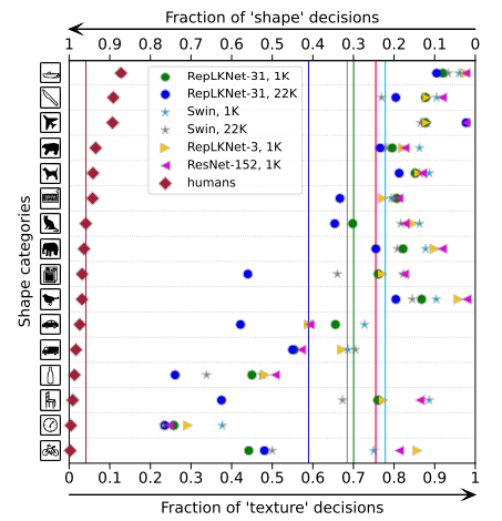 그렇다면 이러한 현상이 발생하는 이유가 무엇일까요? 저자는 Large kernel을 활용하는 것이 feature의 texture보다는 shape에 더 집중할 수 있다고 주장합니다. 이전 연구들에 따르면, ImageNet 속 사진들은 각각의 texture와 shape에 따라서 올바르게 분류가 가능하다고 합니다.