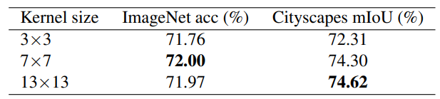 이때의 정량적 결과는 위의 표와 같습니다. 비록 마지막 스테이지의 feature map의 해상도가 작더라도, 이 보다 더 큰 크기의 kernel을 활용하였을 때 3×3 커널보다 더 큰 성능 향상을 보이고 있으며 특히 down-stream task에서 더더욱 좋은 효과를 보여주었다고 합니다.