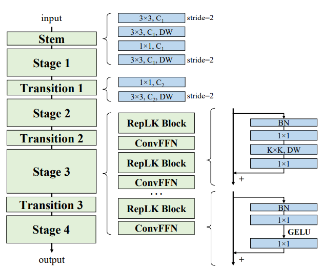 일단 네트워크의 구조는 위의 그림과 같습니다. 일반적인 backbone들처럼 stage가 4개로 구분이 되어있으며, 하나의 스테이지 안에는 RepLK Block과 Convolution Feed Forward Network로 구성이 되어있습니다.