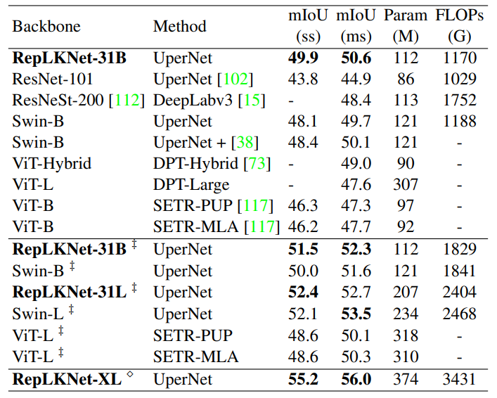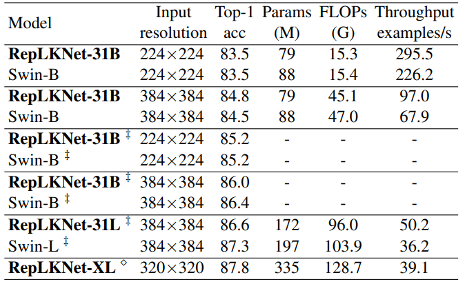 앞에 내용이 너무 길었던 것 같습니다. 이제는 저자가 새롭게 제안하는 RepLKNet에 대한 구조적인 부분들 및 정량적 결과를 보이고 리뷰를 마치도록 하겠습니다.