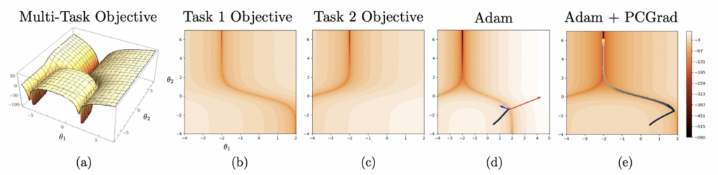 두 태스크를 한번에 최적화해야하는 멀티태스크 러닝에서는 최적화 진행 시 하나의 task gradient 에 지배되어 오히려 다른 하나의 성능을 저하시키는 결과를 발생하게 됩니다. 또한 high curvature로 인해 지배하는 태스크는 오히려 과적합이, 그리고 지배되지 않는 태스크는 오히려 과소적합이 될 수 있죠.