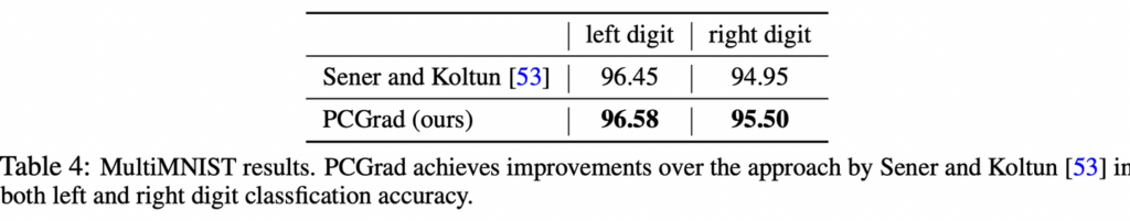 53번 페이퍼와 동일한 조건에서 PCGrad만 추가했을 때 아래와 같은 성능 향상을 가져왔다고 합니다. 해당 실험은 MNIST 에서 랜덤하게 두 개의 이미지를 추출한 다음, 두 개의 이미지를 각각 분류하는 것입니다.