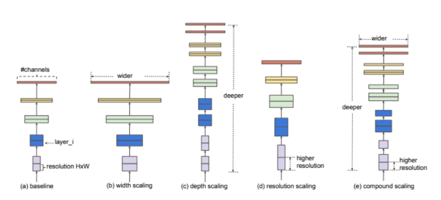위의 그림에는 스케일링의 종류에 대해서 잘 표현되어 있습니다. depth, resolution, width의 scaling을 적절히 섞은 compound scaling (위 그림 e)이 yolov7에서 사용한 스케일링과 유사합니다.