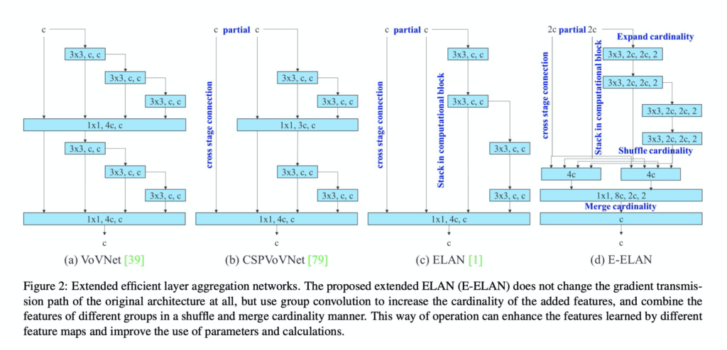 위에 일단 논문 표현대로 설명드렸는데, 쉽게 이야기하자면 그냥 기존 ELAN에서 aggregation 하는 방식에서 아래에 convolution 모듈들과 shuffling 을 추가하여 새로운 E-ELAN을 설계했다고 생각하시면 됩니다.