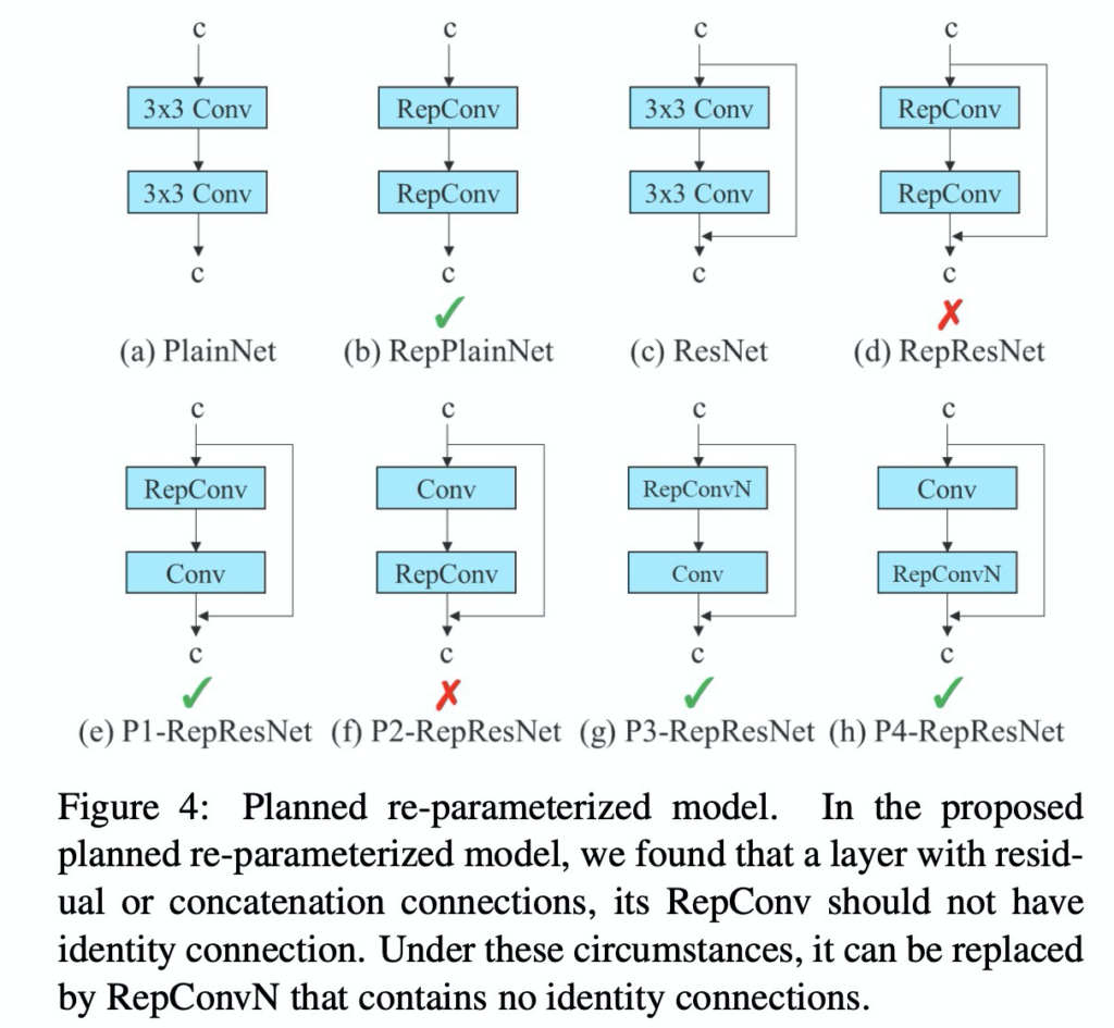 which provides more diversity of gradients for different feature maps. For the above reasons, we use RepConv without identity connection (RepConvN) to design the architecture of planned re-parameterized convolution.