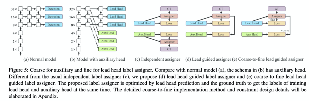 1. 뭔가 새로운 단어도 많이 나오고 정보들이 많이 등장하네요. GPU가 3×3에서 빠르다거나… 용어들이 특히나 엄청 새롭네요. 먼저, Label assignment에 대해서 질문이 있는데요. 처음 보는거라 검색을 조금 해봤더니 일반적으로는 소프트 라벨을 기존 라벨을 아예 대체해서 사용하는 것으로 처음엔 이해했는데요. 다만 그림 5-e를 보면 Lead Head와 Aux Head가 등장하면서 fine/coarse를 Assigner가 할당하는 것을 볼 수 있습니다. 그러면 여기서 이 fine/coarse를 하드 라벨 / 소프트 라벨로 각각 이해하면 될까요? 그리고 이전 버전들을 봐도 lead head와 aux head에 대한 설명이 등장하지 않는데 각각 무엇인지 궁금합니다.