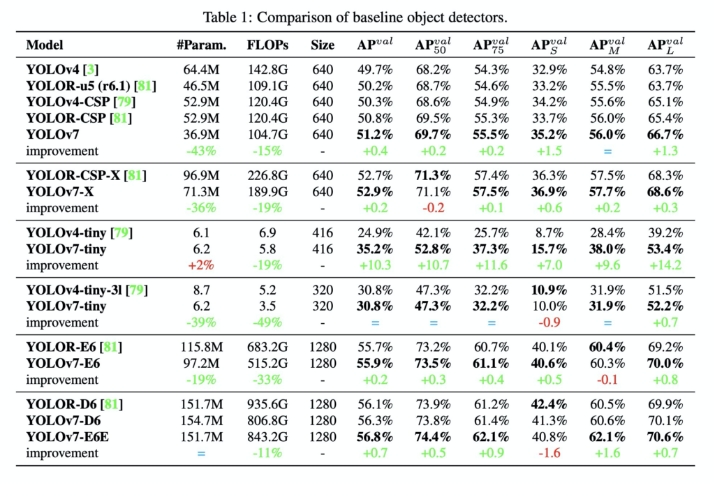 해당 논문의 가장 큰 contribution은 성능과 속도 모두 코코데이터셋 기준으로 기존 욜로알고리즘을 뛰어넘었단 것 입니다. 사실상 이러한 성능을 도출한 방법은 기존에 이미 사용하던 방법들을 조금만 변경하여 사용하였습니다. 그 방법들이 다소 낯설수 있습니다. 저 또한 생소한 방법론들이 많아서 참고자료들을 많이 읽어보았는데, 제가 참고했던 자료들을 같이 소개하며 설명드리겠습니다. 참고자료들을 읽어보지 않고 본 리뷰에서 다루는 내용만으로 v7을 이해하기에는 조금 버거울 수 있습니다. v7을 이해하려면 배경지식이 많이 필요한거 같습니다. 모든 배경지식을 본 리뷰에서 다루는건 좀 무리라고 생각되서 참고자료로 대체한점 양해 부탁드립니다.