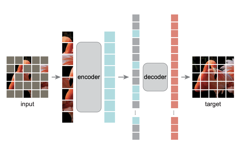 서론이 굉장히 길었습니다. 사실 MAE를 요약하자면, 결국 Self-learning에서의 pretext task로서 이미지의 75% 랜덤한 패치를 가려(masked) 복원하는것으로 설정하였다고 이해하시면 됩니다. 그리고 이 모델의 차별점 및 성능을 다음 Method 및 Experiment에서 확인해보도록 합시다.