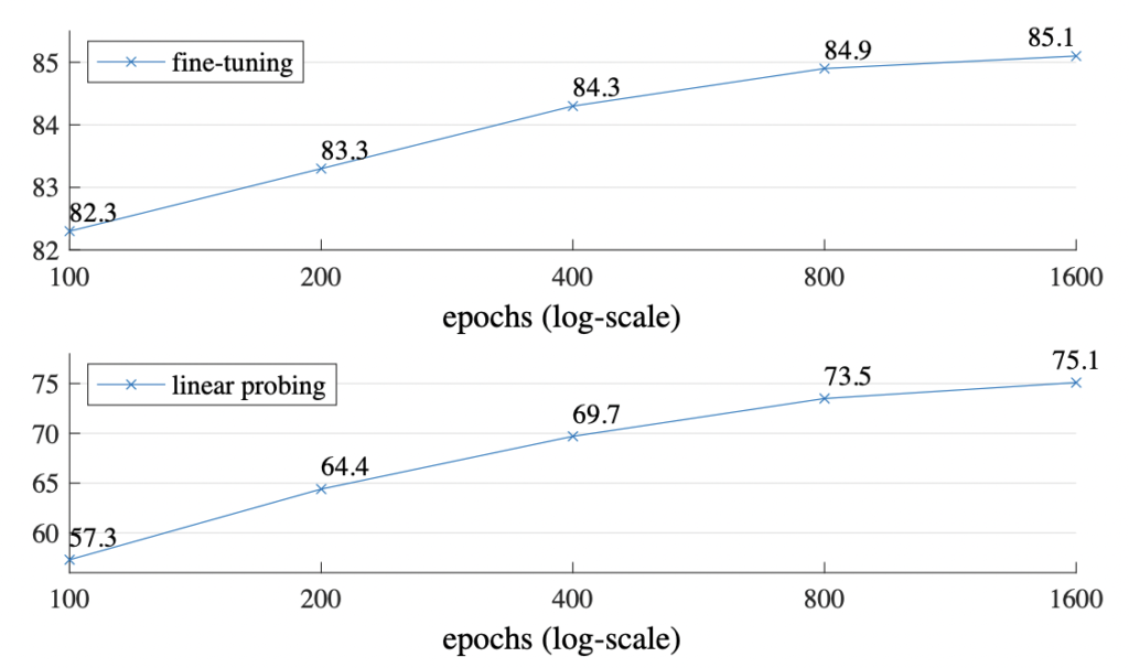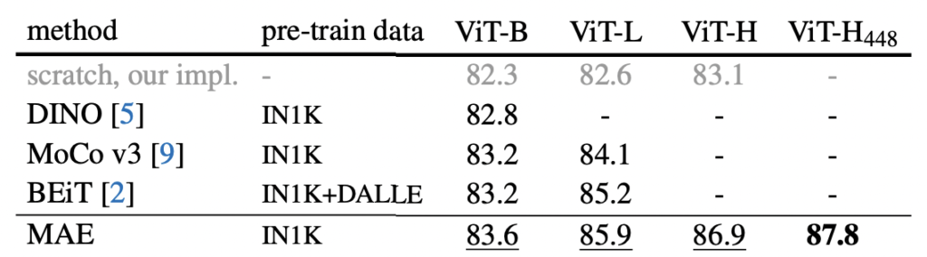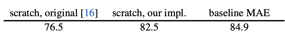 게다가 동일한 하드웨어에서 MAEsms 1600epoch를 31시간동안, MoCo v3는 300 epoch를 36시간동안 학습되었다고 합니다.