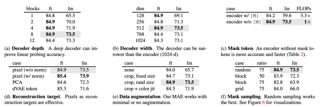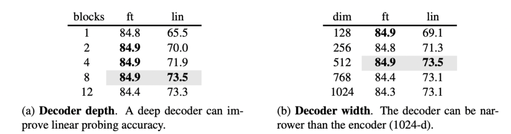 다시 말해 MAE는 8개의 블록과 512-d를 사용하는데, ViT-L은 24개의 블록 그리고 1024-d를 가지기 때문에 토큰 당 FLOPs는 9%에 불과한 경량화된 디코더라고 주장할 수 있는 것이죠.