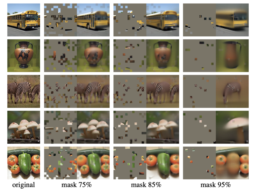 (최적의 마스킹 비율이 75%였는데요) 많은 비율이 무작위로 가려지기 때문에 이미지가 가지는 중복성이 크게 제거되며, 이를 통해 인접한 패치만으로는 이미지를 복원해내기에는 어려운 태스크가 됩니다. 그렇기 때문에 모델은 이미지 전체를 이해해야 각 패치를 잘 복원할 수 있는 것이죠.