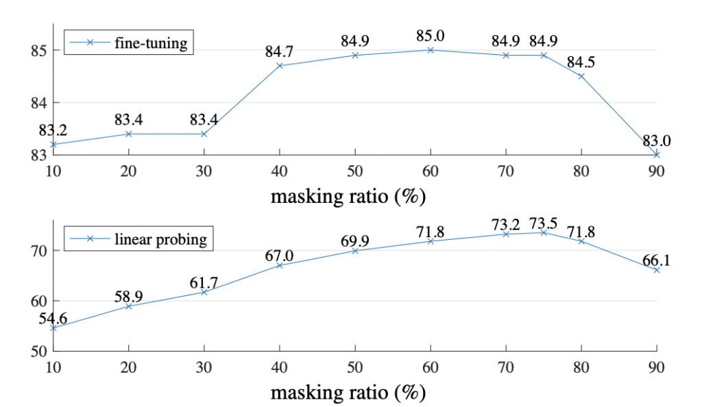 fine-tuning(이하 ft)과 line-probing(이하 lin)에서는 마스킹 비율에 따라 경향성이 다르게 나왔는데요. ft의 경우, 마스킹 비율에 대해 다소 둔감한 반면 lin의 경우 10% <-> 75% 사이 20%라는 정확도 차이가 발생하곤 합니다. 그러나 ft는 마스킹 비율에 상관없이 scratch로 학습한 결과인 82.5%보다 좋았습니다.
