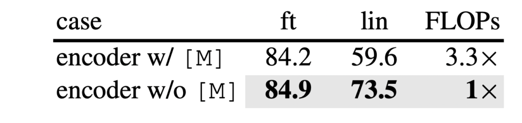 Mask Token. (c)저자가 visible한 패치만 인코더에 넣은 이유는 단순하게 masked 를 같이 넣으니 오히려 성능이 떨어졌기 때문이라고 하는데요. 게다가 FLOPs는 3.3배 줄였습니다. 메모리도 속도도 확연하게 줄여서 더 큰 모델을 학습시키고 배치도 키울 수 있다는 장점이 있죠,.