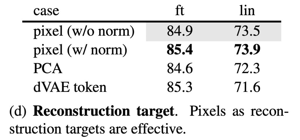 Reconstruction target. (d)앞서 보인 결과는 패치 별 normalization을 적용하지 않은 것입니다. 그런데 이 normalization을 사용하면 정확도가 향상될 수 있습니다. 간단하게 패치 별로 normalization 함으로써 대비를 향상시키고 성능 역시 올라가게 되는 것이죠. 특히 고주파 영역에서 유용하였다고 합니다. 이 외의 PCA나 dVAE라는 BEiT에서 사용된 토큰을 사용하엿는데요. 이건 사전학습이 필요한데다 그닥 높은 성능을 가져오지 않았다는 점을 시사하였습니다.