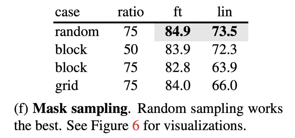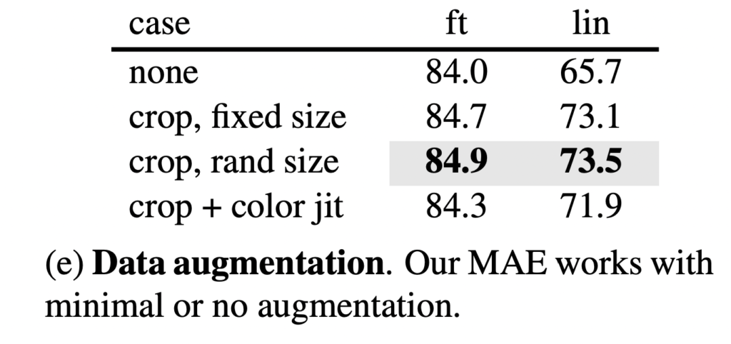 Data Augmentation (e). 데이터 augmentation에 따른 성능 차이인데요. 결과적으로 말하자면 기존 contrastive 기반의 방법론들은 이 데이터 증강에 아주 큰 영향을 받아서 참 다양한 증강 법을 적용했던 것을 기억합니다. 그런데 MAE는 다 필요없이 중앙 크롭만 심지어 플립도 없이 사용하는 것만으로성능이 좋았습니다. 오히려 컬러 지터를 추가하면 성능이 저하되어서 다른 실험을 적용하지도 않았다고 합니다. 그 이유에 대해서 저자는 매번 랜덤하게 마스크를 설정하는 것 자체가 새로운 데이터를 만드는 것이기에, 랜덤 마스킹이 먼저 적용되기 때문에 augmentation은 오히려 recon.을 어렵게 만들게 하는 요인이된다고 이야기 합니다. 즉, 많이 가려서 안그래도 재구성 작업이 어려운데 거기에 augmentation까지 적용하니 어려워졌다는 것이죠.