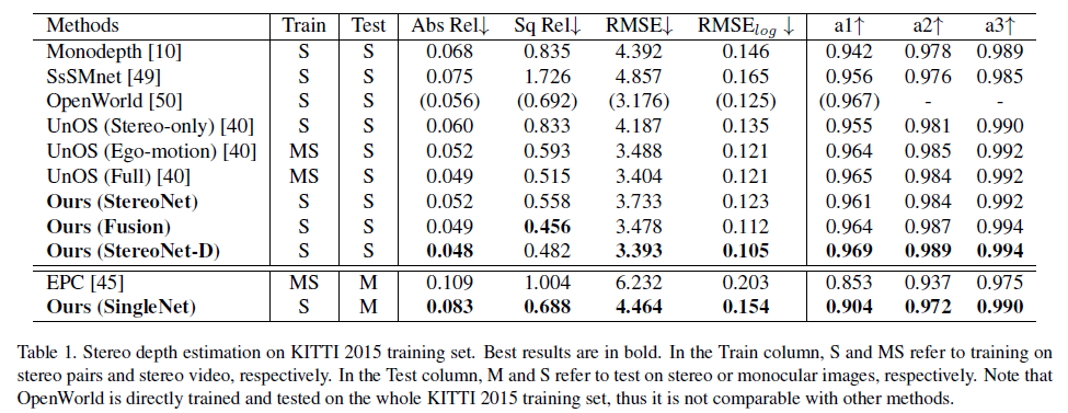 Stereo depth estimation에서의 정량적인 결과는 위와 같습니다.