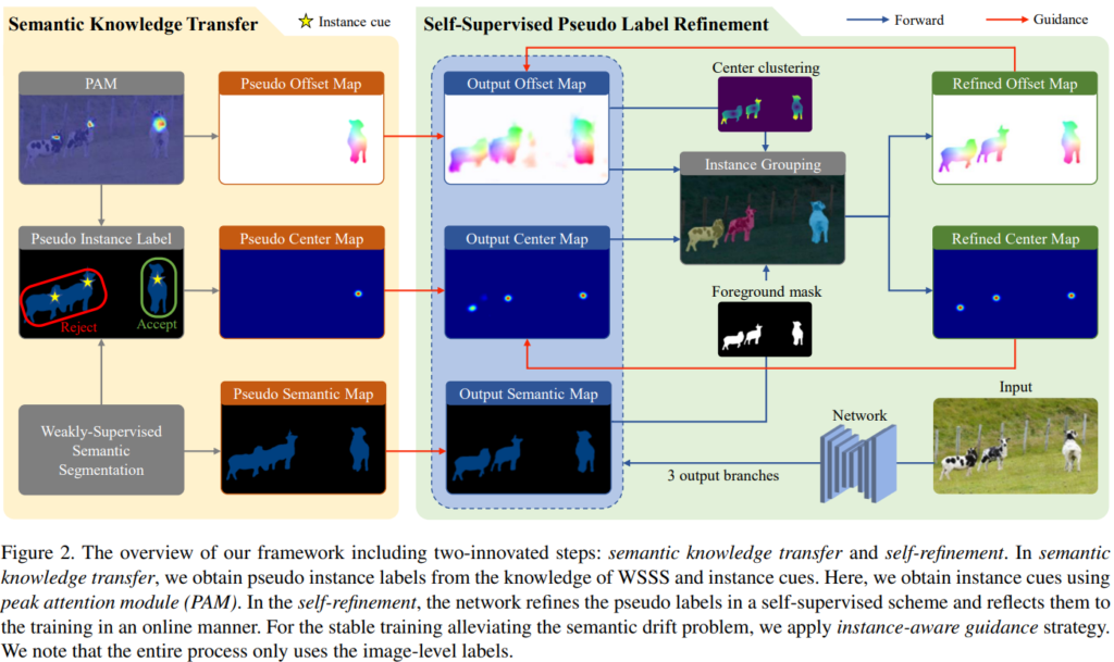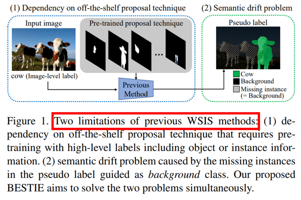 Image segmenatation은 각 object 영역을 구별하면서 이미지에서 object가 차지하는 영역을 예측하는 instance segmentation과 이미지의 각 픽셀을 (일반적으로 사전정의된) 카테고리로 분류하는 semantic segmentation으로 나뉜다. 한편 segmentation은 학습 할 ground truth 마스크를 생성하기 위한 annotation 과정의 비용이 높아 weakly-supervised 기반의 연구도 많이 진행되고 있는데, 일반적으로 weakly-supervised instance segmentation(WSIS)가 weakly-supervised semantic segmentation(WSSS)보다 어려운 태스크라고 받아들여진다. 그 이유는 WSIS문제에는 object의 위치를 찾는 localization task가 내재되어있는데, weakly-supervised는 image level label이 주어지기 때문에 해당 정보(object location)를 갖을 수 없기 때문이다. 기존 방법론은 이러한 문제를 해결하기 위해 off-the-shelf proposal techniques 즉, 사전학습 된 개별 모델을 통해 object를 구분합니다. 그러나 이는 완전 학습 모델이라고 하기에는(사전학습된 모델을 사용하기 때문에) 무리가 있습니다. 이것이 [그림1]에 소개된 기존 방법론의 첫 번째 문제점입니다. 두 번째 문제점은 semantic drift problem 인데, 이는 background라고 잘못 분류된 pseudo label이 학습에 사용되는 경우 입니다.