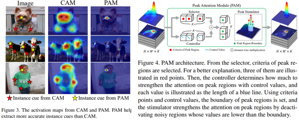 논문에서 앞선 문제점(off-the-shelf proposal techniques, semantic drift problem)을 해결하기 위한 해결책은 다음과 같습니다. 먼저 off-the-shelf proposal techniques 문제를 해결하기 위해 논문은 Semantic knowledge transfer 를 설계했습니다. cost 가 많이 들어가는 instance detection 모델을 사용하던 기존 WSIS 방법론과 다르게 Peak Attention Module(PAM)을 이용하여 weakly supervised semantic segmentation 모델의 출력을 instance level로 가공하면서 pseudo label을 생성했습니다. 여기서 PAM이란 [그림4]에서 확인할 수 있듯이 CAM 연구의 일종이며, 쉽게 생각하면, CAM을 필터링하여 피크지점을 찾는 모듈로 이해하시면 됩니다.