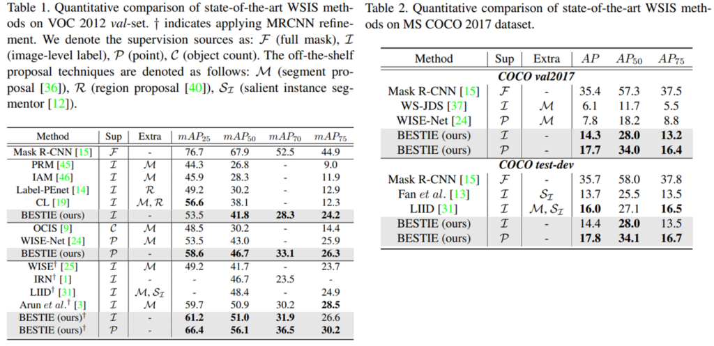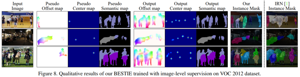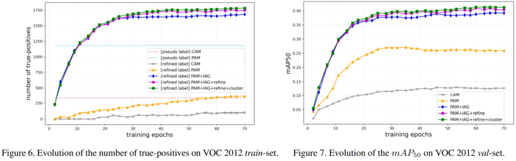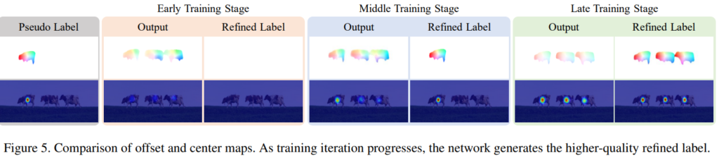 다음으로 semantic drift problem 해결을 위해 pseudo label refinement 파트를 통해 drift를 제거하였습니다. FixMatch 연구에서 pseudo label의 신뢰도를 thresholding 한 것과 같이, 이미지에서 생성된 pseudo instance semgnetation mask 중에서 신뢰도가 높은 object에 대해 offset 을 예측하는 모델을 이용하여 refinement를 합니다. 이때, 모델 기준으로 pseudo label에 대한 확신도가 낮은 object 영역의 경우 학습에 포함하지 않아 pseudo label의 잘못된 예측으로 인한 성능 하락도 막았습니다. [그림 3]을 보면 모델의 pseudo label 생성 능력이 높아질 수록, 데이터로 이용할 수 있는 pseudo label mask도 증가하는 것을 확인할 수 있습니다.
