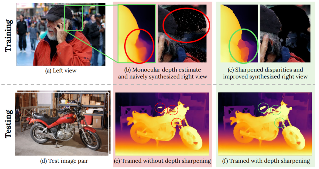 그림 1을 보시면 이 논문이 제안하는 방법론이 무엇인지 볼 수 있습니다. Mono Network를 통해서 Depth를 추정한고 scale이 맞는 disparity를 추정한 후 sharpening을 통해 depth를 더욱 정확하게 만들어줍니다. 그리고 warping 방식을 통해서 오른쪽 영상을 생성합니다.