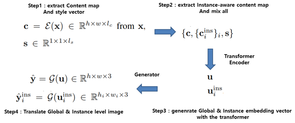 이렇게 instance region과 global 영역으로 token들이 나뉘어지면 이 둘을 섞어서 Transformer \mathcal{T} encoder에 입력으로 넣어주면 global embedding vector u과 instance embedding vector u^{ins}_{i} 를 생성할 수 있게 됩니다. 이러한 embedding vector들은 각각 generator에 들어가서 translation 결과를 생성하게 됩니다.