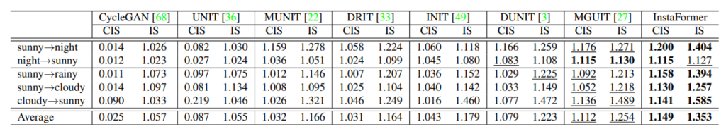정량적 결과 살펴보시면 sunny, night, cloudy, rainiy 등과 같은 변환에 대해서 제안하는 방법론이 대부분 가장 좋은 성능을 보여주고 있습니다. IS와 CIS는 각각 Inception Score와 Conditional Inception Score라는데 음.. 해당 metric을 잘 몰라서 저정도 차이가 엄청 큰 성능 향상인지는 잘 모르겠습니다.(일단 높으면 높을수록 더 좋다고 합니다.)