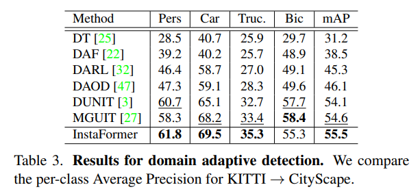 위에 표는 KITTI 데이터셋을 City Scape로 DA를 적용한 다음에 Faster-RCNN에 대한 MAP 성능을 나타낸 것이라고 합니다. Bic를 제외하고는 모두 가장 좋은 성능 향상 폭을 보여주고 있습니다.
