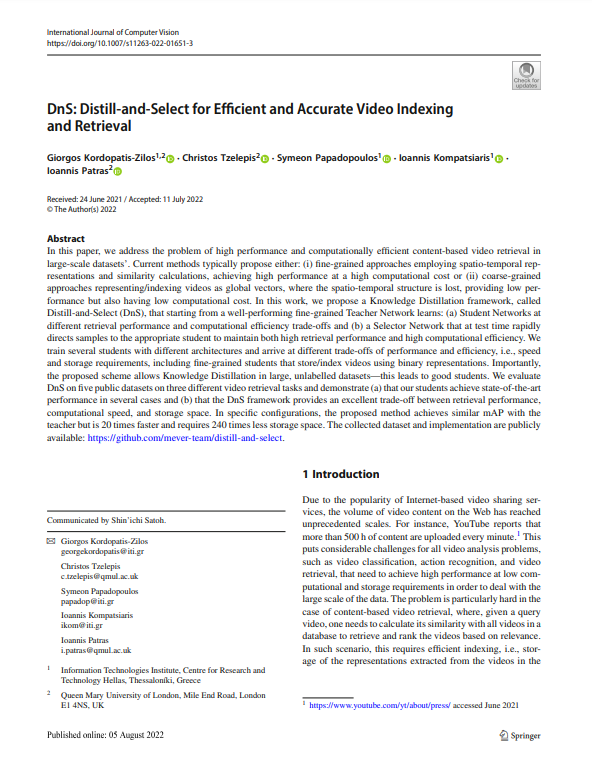 간만에 리뷰할 논문은 “DnS: Distill-and-Select for Efficient and Accurate Video Indexing and Retrieval” 라는 논문으로, CBVR에서 유명한 방법론인 ViSiL의 저자가 투고한 논문입니다. 저희가 논문을 준비하던 8월 전까지는 arxiv에 preprint로 공개되어 있었으나, 8월 초에 IJCV에 accept이 되어 출판된 것으로 보입니다.