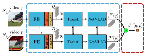 Coarse-graine Student (S^{c})는 앞선 과정들과 유사하게 frame-level feature를 추출하는 과정은 ViSiL을 따르나 이를 입력으로 Transformer와 NetVLAD를 거친다는 차이점이 있습니다. 여기서 Transformer와 NetVLAD는 흔히들 들어보셨던 그 모델들이 맞으며, Transformer의 경우 각 frame-level feature 간의 self-attention을 목적으로, NetVLAD는 frame-level feature들을 모아 video-level feature로 만들기 위해 사용되었습니다.