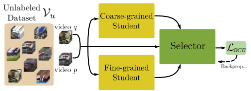 본 논문에서는 이 두 종류 stream의 장점들만을 취합하고자 Knowledge Distillation scheme을 활용하였습니다. 검색 능력은 좋지만 inference가 느린 frame-level feature 기반 방식을 Teacher로 두고 student 모델들을 학습시켰으며, student 모델들 사이에 Selector Network를 두어 reranking 하는 방식 또한 고안해내었습니다.