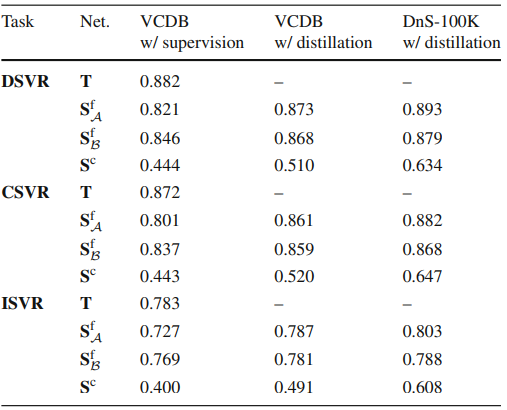 Table 2는 Student Network들에 대해 Supervision과 Disitillation 했을 때의 FIVR-5K ISVR 성능입니다. 방금 전 ablation에서 이야기 했던 모든 방법에 대해 VCDB에서 supervision으로 학습한 성능이 이 테이블에 있으며, Fine-graine Attention Student는 Teacher와 대부분 동일하지만 하나의 Linear Layer를 통해 Projection하는 부분이 추가되었을 뿐인데도 Teacher보다 낮은 성능을 보였습니다. 사실, 저도 이 부분을 ViSiL 코드를 기반으로 실험하면서 알고 있었는데, 이는 VCDB 데이터 셋이 feature representation을 모델에게 학습시키기에는 적합하지 않은 데이터 셋이기 때문이며 (실제로 상당히 주제를 알기 어려운 비디오 다수 존재), 이러한 이유로 직접적으로 feature를 projection 하는 경우 그렇지 않았을 때보다 낮은 성능을 나타내게 됩니다. 이 문제를 본 저자는 DnS-100K에서의 distillation을 통해 해결하고자 한듯합니다.