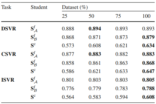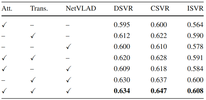 Table 3는 Student Network를 학습시키기 위해 사용된 DnS-100K의 데이터 비율에 대한 Ablation 결과입니다. Distillation에 사용되는 비디오의 비중을 높여감에 따라 특히나 feature를 projection 시키는데 영향을 많이 받는 Coarse-grained Student의 성능이 높아지는 것을 보았을 때, DnS-100K가 VCDB보다는 학습에 도움이 되는 데이터 셋임을 나타냅니다.