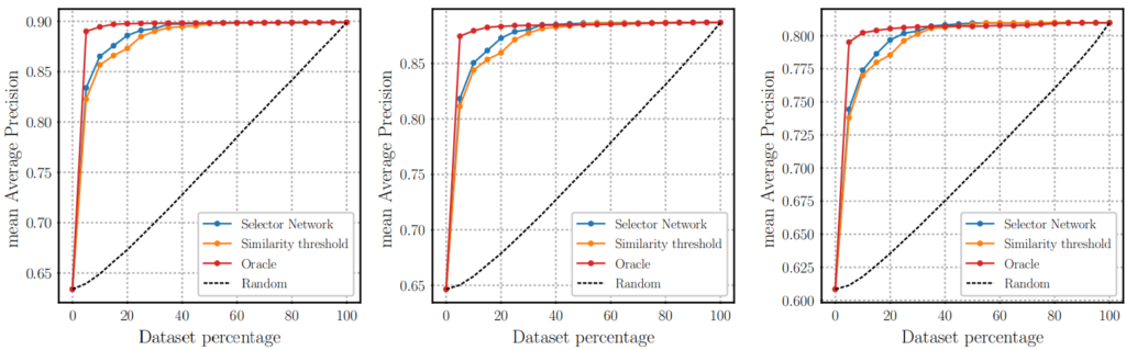 Fig 8은 Selector Network를 통해 Coarse Student로부터 반환된 유사도 순위 중 N%를 re-ranking했을 때의 성능입니다. 여기서 re-ranking되는 순위의 유사도는 Fine-grained Student로부터 가져오게됩니다. 실제로 GT를 알고 re-ranking 하는 Oracle 방식에 가장 근접하게 Selector Network가 작동하는 경향성을 보여줍니다.