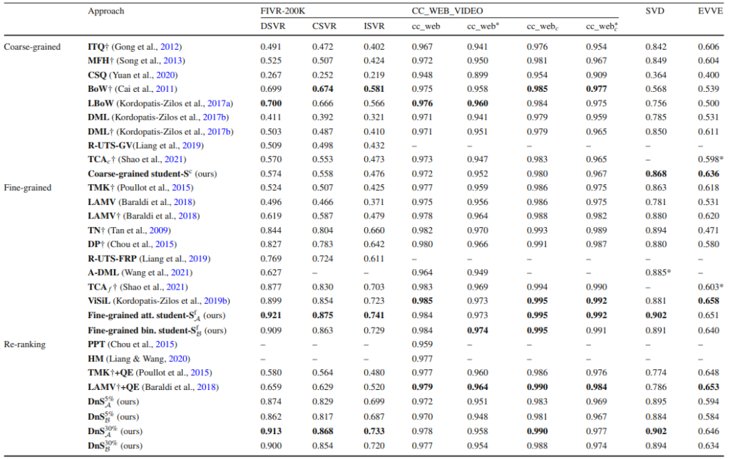 성능만 놓고 보았을 때는 가장 높은 성능을 달성하긴 했으나, 사실 한가지 아쉬운점은 reasonable한 비교인가에 대한 것입니다. 제가 논문을 준비하면서 알게 된게, Coarse-grained 즉 Video-level feature 기반 방식 중 가장 높은 성능을 보이는 것처럼 표시되어 있는 LBoW의 경우, 다른 여러 방법들이 하는 것과 마찬가지로 VCDB 데이터 셋에서 학습된 것이 아닌, FIVR 데이터 셋에서 K-fold를 나눠 학습 및 평가된 성능입니다. 또한 이 논문에서 제안된 Student들은 모두 DnS-100K라는 새로운 데이터 셋에서 Distillation 된 성능이며, 그리고 모든 방법 공통적으로 Backbone network가 다르다는 점입니다. 서로 고정된 세팅을 가지고 하는 것이 아니기에 성능이 높은 방법이 정말로 제안된 방식 때문에 성능이 높은 건지, 혹은 그냥 Backbone network가 좋아서 높은 건지 알 수 없기에 이 테이블 만으로는 reasonable한 비교가 어려워집니다. 때문에 앞으로 이 분야가 계속되려면, 저 포함해 이 분야를 하고 있는 연구자들은 최대한 같은 세팅으로 실험을 하여 reasonable한 비교가 가능하도록 실험하는 것이 필요해보입니다.