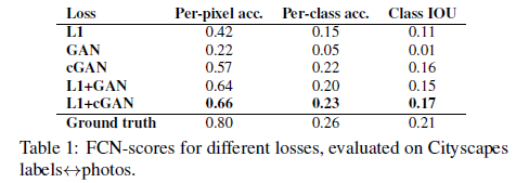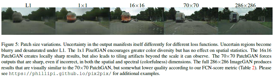 위의 Discriminator 의 설명에서 고주파 영역에 집중을 해야하기 때문에 image를 patch 단위로 나눠서 real, fake를 판별한다고 언급 했습니다. 그에 따른 실험 결과인데, 70×70 patch를 사용할 때에 가장 좋은 성능을 낸다고 합니다.