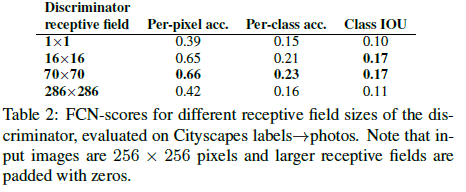 리뷰 마지막쯤 patchGAN의 receptive field 별 정성적, 정량적 결과를 첨부해주신 부분에서 질문이 있습니다.