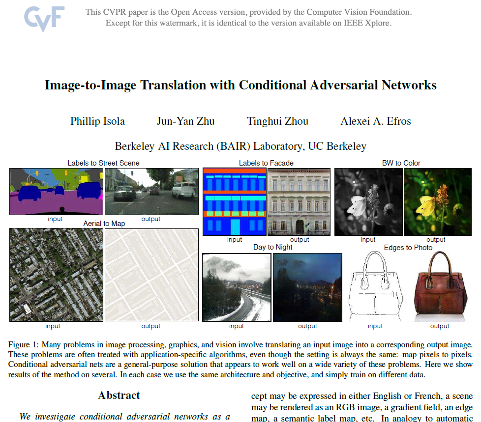 본 논문은 2017 CVPR에 게재된 논문이고, pix2pix라는 이름으로도 잘 알려져 있는 논문입니다.