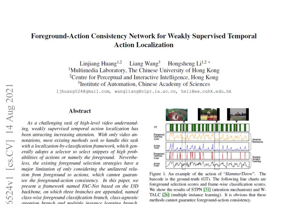 이번 X-Review에서 제가 소개해드릴 논문은 2021년 ICCV에 게재된 ‘Foreground-Action Consistency Network for Weakly Supervised Temporal Action Localization’ 이라는 논문입니다. 편의 상 줄여서 ‘FACNet’이라고 칭하겠습니다.