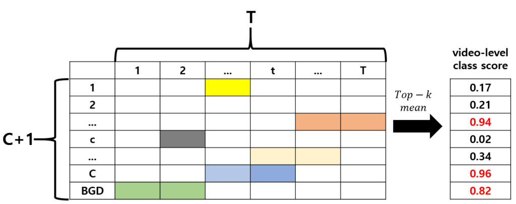비디오의 feature를 임베딩 하여 모듈에 태우면 위 그림과 같은 CAS를 얻을 수 있습니다. 이후 CAS로부터 classification과 localization을 수행하는 과정을 간단히 설명드리겠습니다.